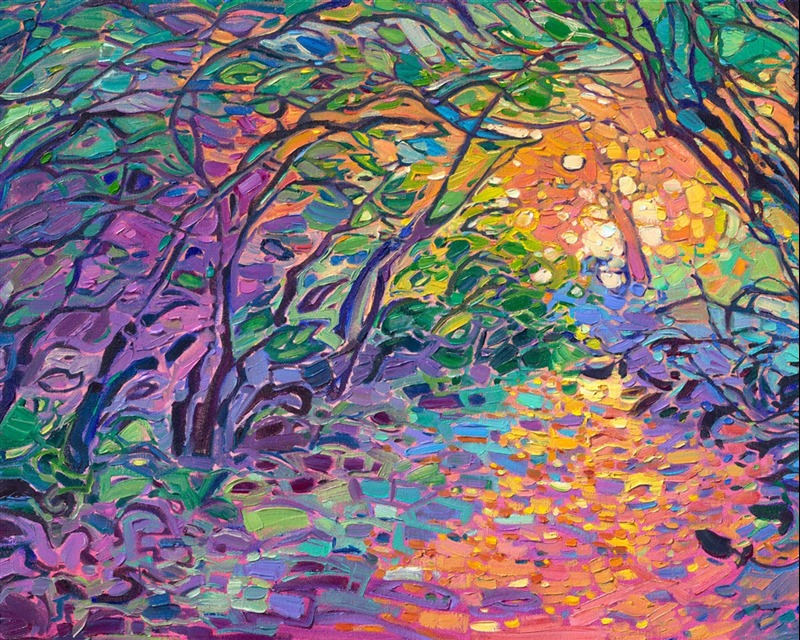 Style: "Open Impressionism" is a new style of painting developed by American artist Erin Hanson. The style is characterized by short, impasto brush strokes that are applied without layering, creating a mosaic or stained-glass appearance to the paintings. The paintings are created with a limited palette of colors, applied without blending or mixing upon the canvas, which adds a dimension of texture to each brush stroke. Inspired by classic impressionism, pointillism, and post-impressionism, Erin Hanson continues the tradition of impressionism into the modern day with her colorful and vivacious landscape paintings.
