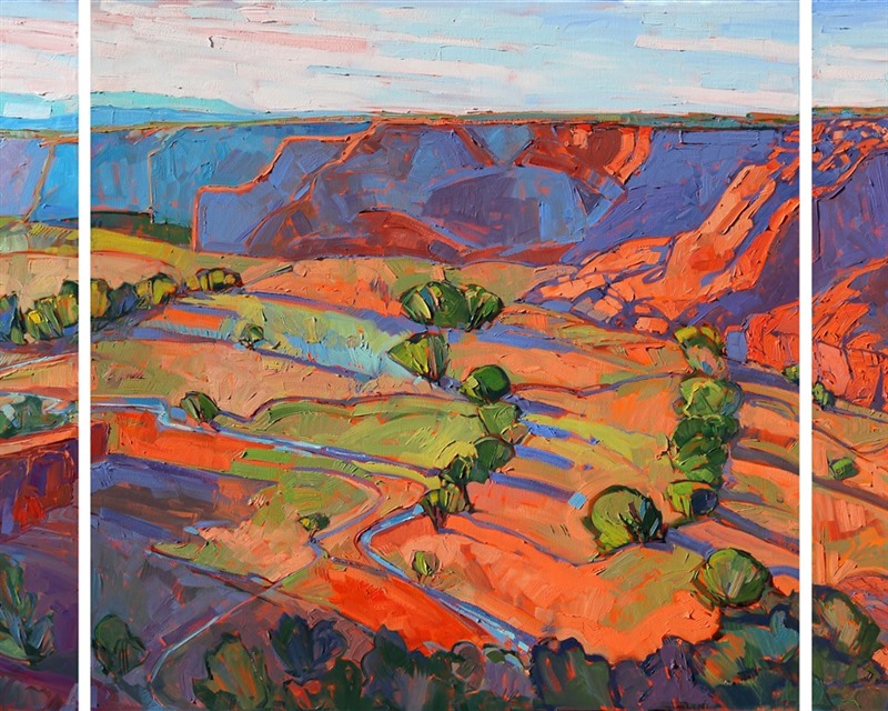 This wide triptych gives you the feeling of wide open space that you feel in your gut when you stand at the edge of Canyon de Chelly. The abstract shapes in the landscape fit together like a mosaic of color and texture.