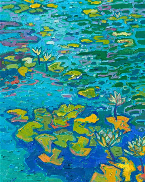 "Patterns of Lilies" is an original oil painting on linen board. The piece arrives framed in custom plein air frame, ready to hang.