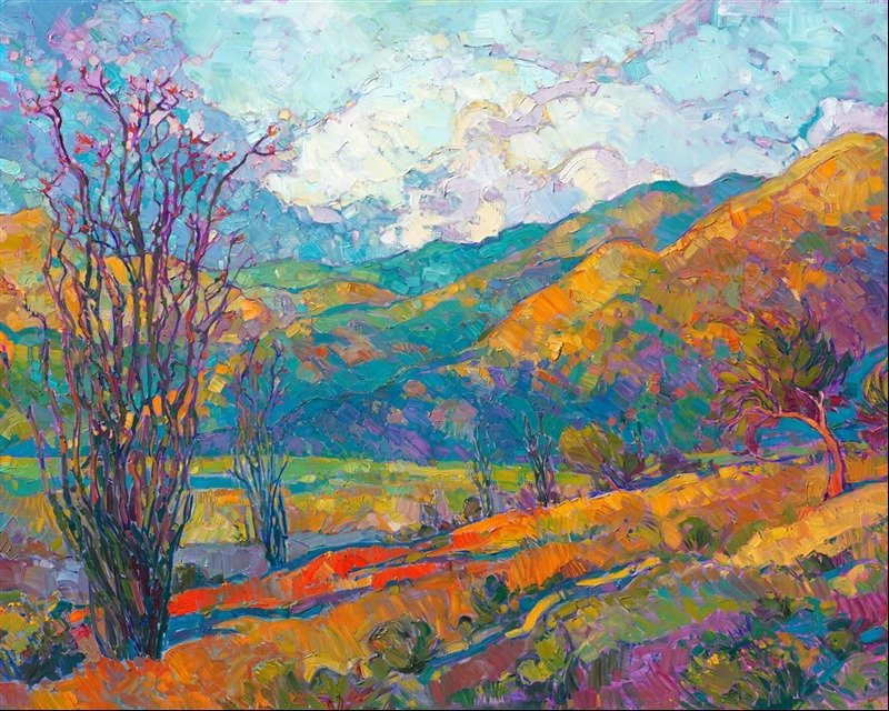 Borrego Springs is most beautiful in March and April, when the desert blossoms carpet the desert floor and the brown earth turns green with tiny desert plantlife. This painting captures the peaceful morning light of Southern California's high desert.