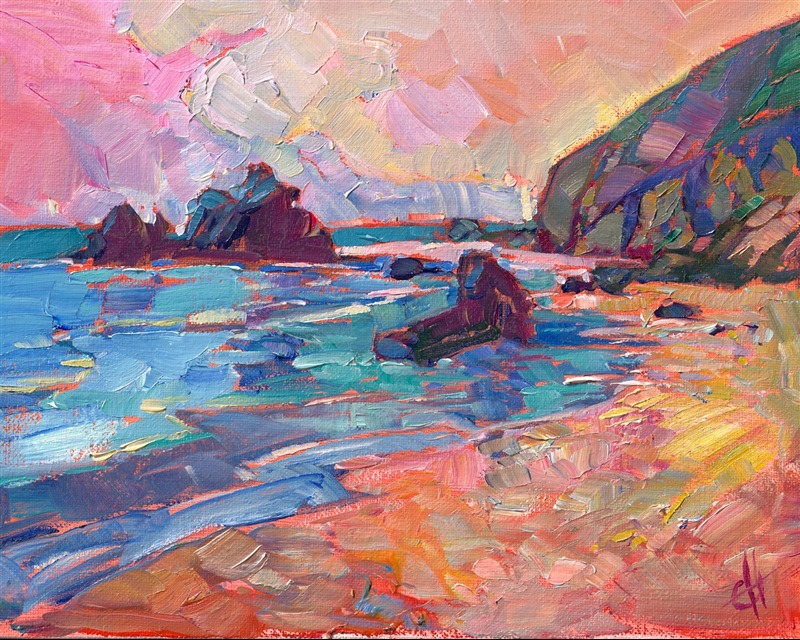 Peach colored light casts its hue across this rocky beach of central California. The brush strokes in this painting are loose and impressionistic, full of color and motion.