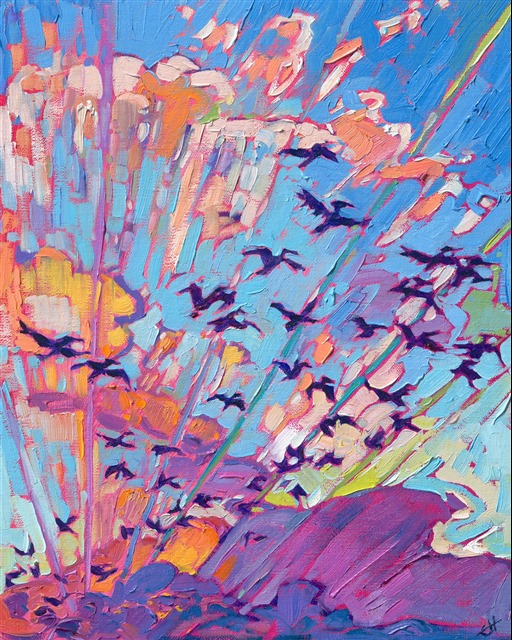 I was enjoying a sunset at Cannon Beach in Oregon, when a flock of pelicans began flying through the air above me, obviously as entranced with the vivid colors as I was. This painting captures the moment with thick brushstrokes of oil paint.