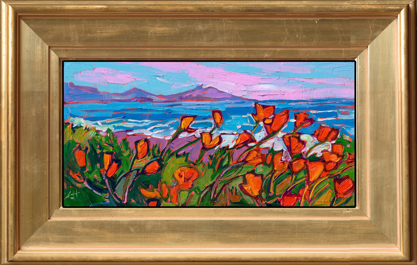 A flurry of orange poppies caught my attention growing along Highway 1 in California. The bright canary blooms seemed to vibrate with color against the aqua blue backdrop of the Pacific Ocean. Thick, impasto brush strokes capture the movement and life of the scene.