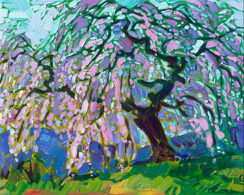 The weeping cherry trees of Kyoto, Japan, are captured on a petite canvas by American impressionist Erin Hanson, creator of Open Impressionism. This small work captures the beauty of the pink cherry blossoms and the graceful, ancient branches of this famous tree.