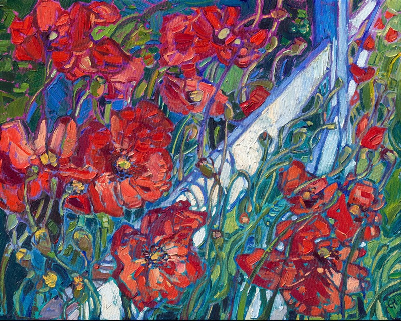 When I returned to the same location, I discovered the poppies had been replaced by Shasta daisies. I did, however, find one small patch of red poppies still remaining, growing tenaciously beneath a white picket fence bordering the lavender field. I loved the way the red poppies contrasted with the white fence—and this painting was born.