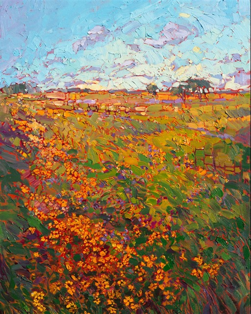 Style: "Open Impressionism" is a new style of painting developed by American artist Erin Hanson. The style is characterized by short, impasto brush strokes that are applied without layering, creating a mosaic or stained-glass appearance to the paintings. The paintings are created with a limited palette of colors, applied without blending or mixing upon the canvas, which adds a dimension of texture to each brush stroke. Inspired by classic impressionism, pointillism, and post-impressionism, Erin Hanson continues the tradition of impressionism into the modern day with her colorful and vivacious landscape paintings.