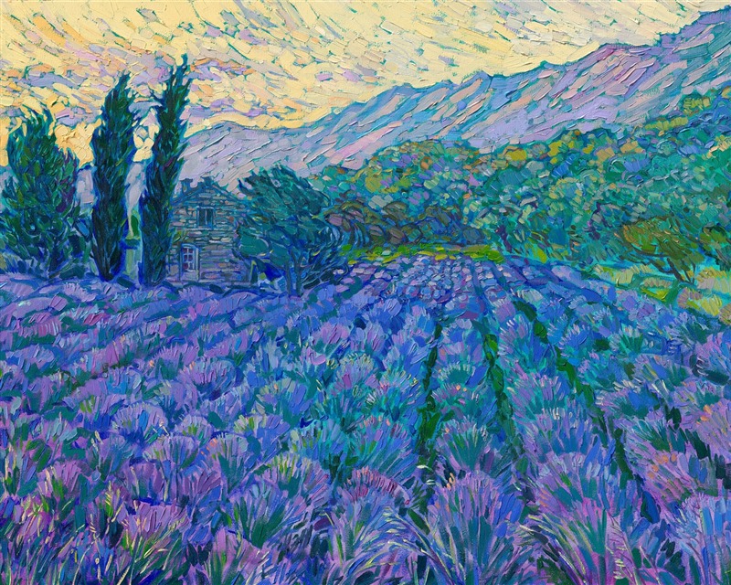 This summer, I took a river boat cruise along the Seine to get inspiration from the many places the first impressionists painted, and I then traveled all across France, from Etretat to Provence, gathering inspiration. This painting captures the beautiful lavender fields of Provence, captured during the golden light of dawn. The stone house nestled among the cypress trees demanded to be included in the painting.