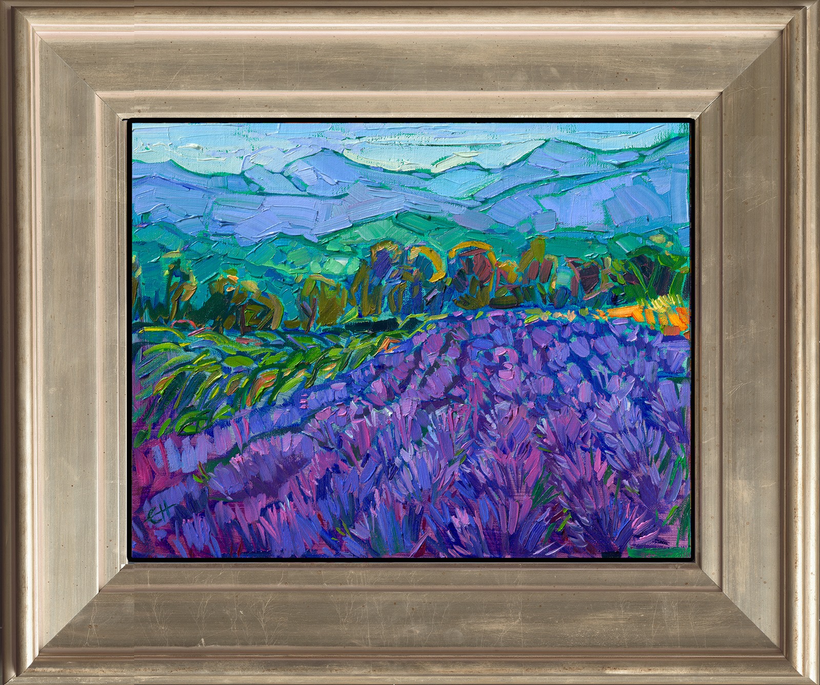 Note on varnishing: Erin’s paintings take six to eight weeks to dry, at which time we apply a retouching varnish, which allows the painting to complete the curing process while having a layer of protection against dirt and scuffs. The full curing process for an impasto oil painting takes at least two years. We are happy to assist in applying a final finishing varnish to your Erin Hanson oil painting once it has been dry for at least two years. Here is more information on how to care for your original oil painting.
