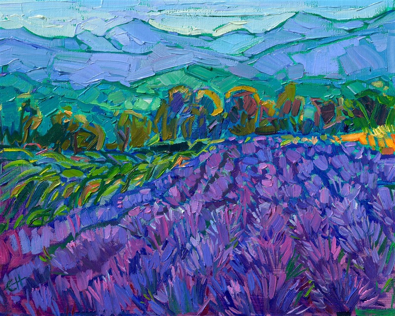 Seeing the lavender fields in Provence and Valensole was one of the highlights of my photo safari in France. This painting captures the rich colors of lavender fields against the alpine peaks in the distance. Thick brushstrokes communicate the texture and movement of the scene.