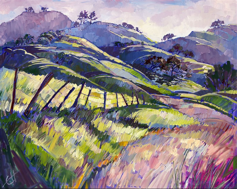 Style: "Open Impressionism" is a new style of painting developed by American artist Erin Hanson. The style is characterized by short, impasto brush strokes that are applied without layering, creating a mosaic or stained-glass appearance to the paintings. The paintings are created with a limited palette of colors, applied without blending or mixing upon the canvas, which adds a dimension of texture to each brush stroke. Inspired by classic impressionism, pointillism, and post-impressionism, Erin Hanson continues the tradition of impressionism into the modern day with her colorful and vivacious landscape paintings.