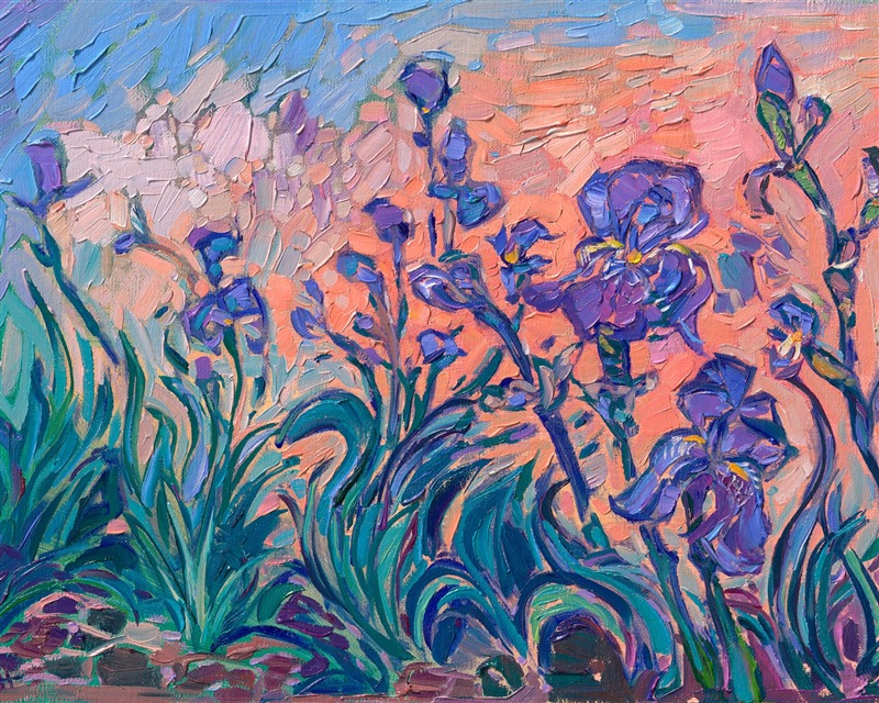 A cluster of purple irises bloom in the red earth of Sedona, Arizona. This painting captures the striking color contrasts of flowers in the desert. Short, expressive brushstrokes bring texture and movement to the piece.