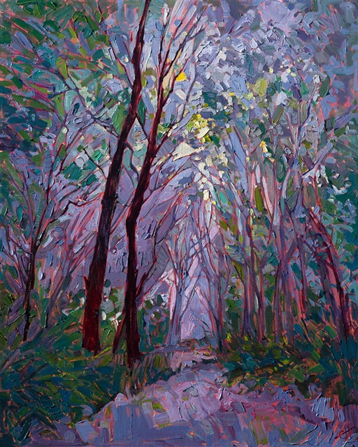 Rising morning mist unveils layers of trees, pulling you deeper into the inviting forest. Thick layers of paint create an interlacing mosaic of color and texture.
