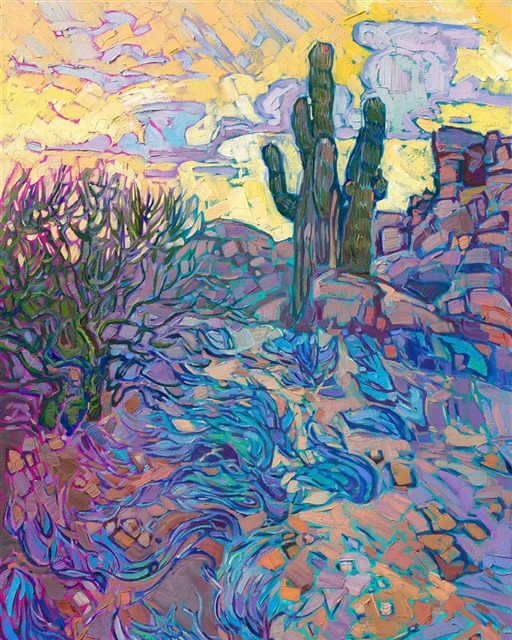 Note on varnishing: Erin’s paintings take six to eight weeks to dry, at which time we apply a retouching varnish, which allows the painting to complete the curing process while having a layer of protection against dirt and scuffs. The full curing process for an impasto oil painting takes at least two years. We are happy to assist in applying a final finishing varnish to your Erin Hanson oil painting once it has been dry for at least two years. Here is more information on how to care for your original oil painting.