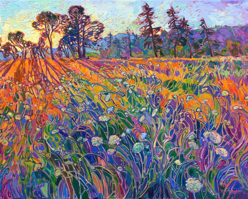 Waving fields of Queen Anne's lace, wildflowers, and long summer grasses draw the eye into radiating shadows of this Open Impressionism painting by Erin Hanson. Thick brushstrokes of oil paint create patterns of texture that keep the eye moving throughout the painting. This painting captures the golden hour light in the Oregon countryside.