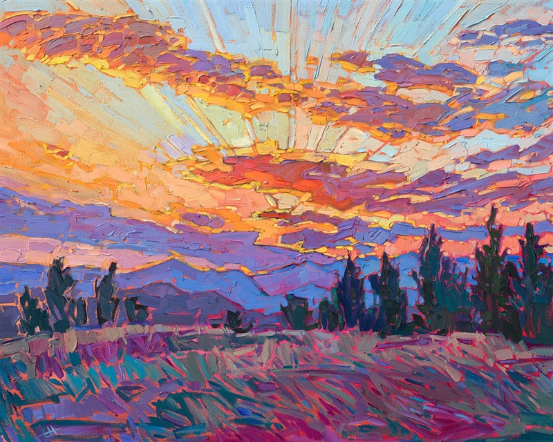 Note on varnishing: Erin’s paintings take six to eight weeks to dry, at which time we apply a retouching varnish, which allows the painting to complete the curing process while having a layer of protection against dirt and scuffs. The full curing process for an impasto oil painting takes at least two years. We are happy to assist in applying a final finishing varnish to your Erin Hanson oil painting once it has been dry for at least two years. Here is more information on how to care for your original oil painting.