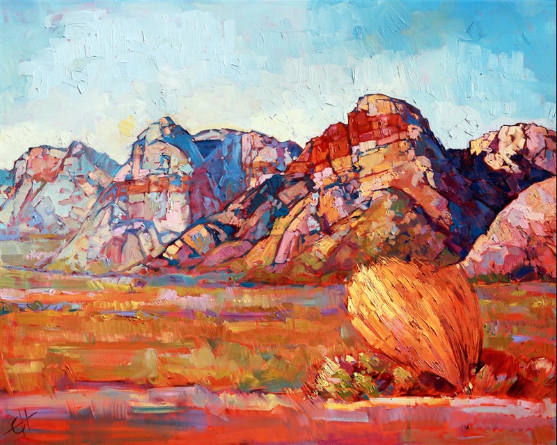 This familiar scene of Rainbow Mountains from the 13-mile loop road of Red Rock Canyon always brings happy memories of rock climbing to the artist's mind. The flat desert floor ends abruptly in towering sandstone cliffs, the shadows cool and blue, keeping cool even during the hot summer months. This painting brings to life the beauty and emotion of seeing Rainbow Mountains for the first time.