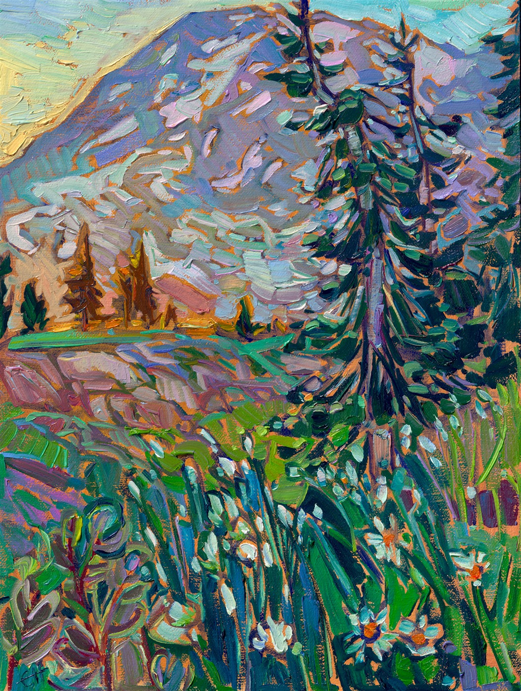 Style: "Open Impressionism" is a new style of painting developed by American artist Erin Hanson. The style is characterized by short, impasto brush strokes that are applied without layering, creating a mosaic or stained-glass appearance to the paintings. The paintings are created with a limited palette of colors, applied without blending or mixing upon the canvas, which adds a dimension of texture to each brush stroke. Inspired by classic impressionism, pointillism, and post-impressionism, Erin Hanson continues the tradition of impressionism into the modern day with her colorful and vivacious landscape paintings.