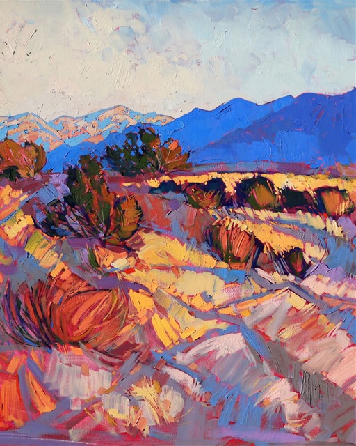 Style: "Open Impressionism" is a new style of painting developed by American artist Erin Hanson. The style is characterized by short, impasto brush strokes that are applied without layering, creating a mosaic or stained-glass appearance to the paintings. The paintings are created with a limited palette of colors, applied without blending or mixing upon the canvas, which adds a dimension of texture to each brush stroke. Inspired by classic impressionism, pointillism, and post-impressionism, Erin Hanson continues the tradition of impressionism into the modern day with her colorful and vivacious landscape paintings.