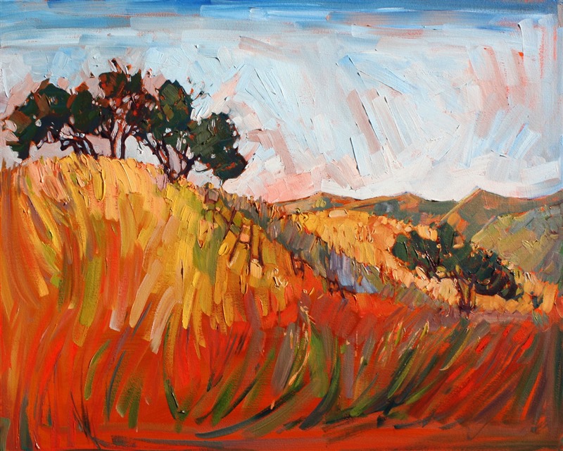 Central California turns a vibrant red-gold as the landscape heats up in summer. The crisp golden grass is a lovely contrast against the green oak trees. This painting is the first in a series of two.
