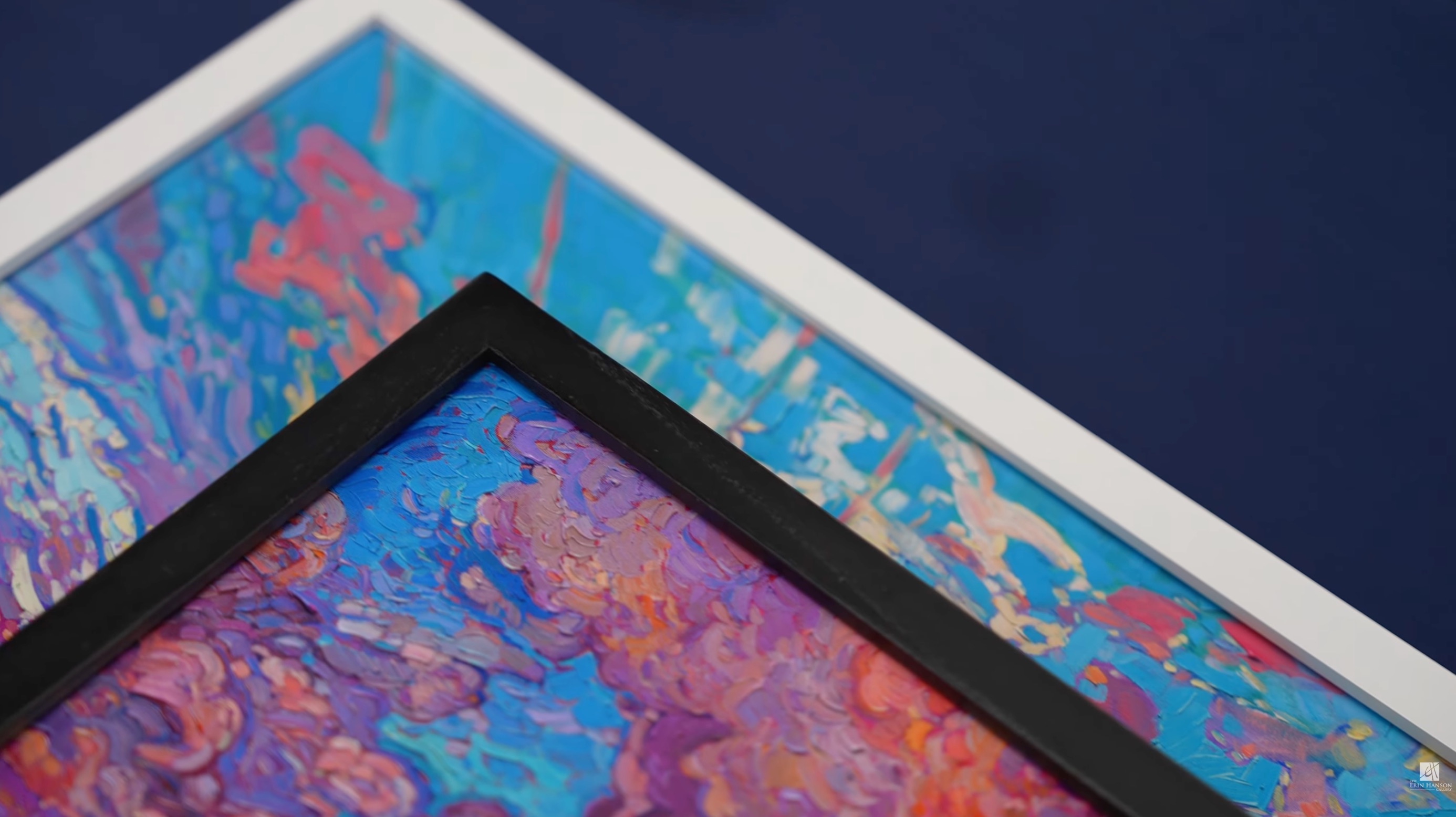 This elegant floater frame is specially chosen by Erin Hanson to set off her original works and 3D Textured Replicas. Erin paints her paintings with deliberate texture all the way to the edges of her canvas, so a floater frame allows you to enjoy the full picture. The frame's top face is finished in gold leaf, and the sides are black. The molding is 1/2" wide.