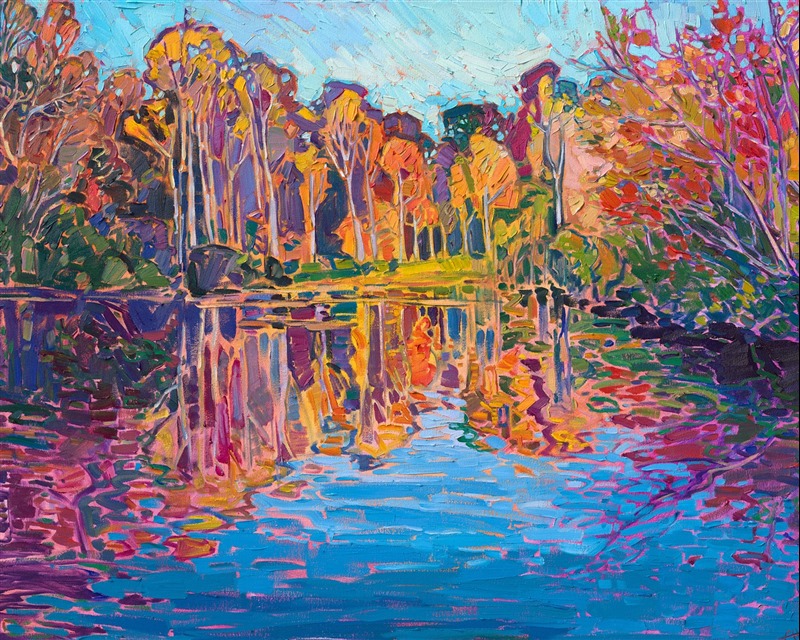 "Autumn Reflections" is an original oil painting by Erin Hanson, created on stretched canvas. The piece arrives framed in a contemporary gold floater frame, ready to hang.