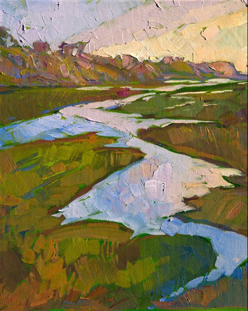 Style: "Open Impressionism" is a new style of painting developed by American artist Erin Hanson. The style is characterized by short, impasto brush strokes that are applied without layering, creating a mosaic or stained-glass appearance to the paintings. The paintings are created with a limited palette of colors, applied without blending or mixing upon the canvas, which adds a dimension of texture to each brush stroke. Inspired by classic impressionism, pointillism, and post-impressionism, Erin Hanson continues the tradition of impressionism into the modern day with her colorful and vivacious landscape paintings.