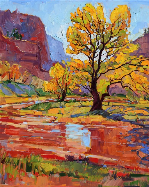 Erin's 50-mile trek through Zion National Park continues to inspire oil paintings. This painting captures the day-long hike through Hop Valley, the muddy red sands reflecting the November cottonwoods in their watery surface.