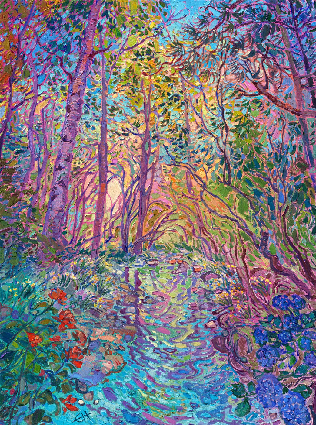 Style: "Open Impressionism" is a new style of painting developed by American artist Erin Hanson. The style is characterized by short, impasto brush strokes that are applied without layering, creating a mosaic or stained-glass appearance to the paintings. The paintings are created with a limited palette of colors, applied without blending or mixing upon the canvas, which adds a dimension of texture to each brush stroke. Inspired by classic impressionism, pointillism, and post-impressionism, Erin Hanson continues the tradition of impressionism into the modern day with her colorful and vivacious landscape paintings.