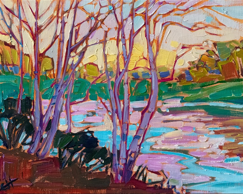 Note on varnishing: Erin’s paintings take six to eight weeks to dry, at which time we apply a retouching varnish, which allows the painting to complete the curing process while having a layer of protection against dirt and scuffs. The full curing process for an impasto oil painting takes at least two years. We are happy to assist in applying a final finishing varnish to your Erin Hanson oil painting once it has been dry for at least two years. Here is more information on how to care for your original oil painting.