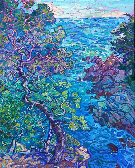 With warm Mediterranean winds blowing in my face, I explored the rocky coastline of the French Riviera. Aqua blue waters and wind-bend pine trees completed the experience. This painting captures the movement and beauty of the scene.