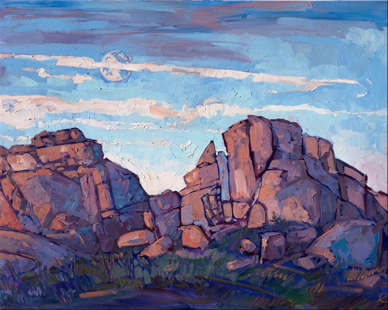 ERIN HANSON has been painting in oils since she was 8 years old. As a teenager, she apprenticed at a mural studio where she worked on 40-foot-long paintings while selling art commissions on the side. After being told it was too hard to make a living as an artist, she got her degree in Bioengineering from UC Berkeley. Afterward, Erin became a rock climber at Red Rock Canyon, Nevada. Inspired by the colorful scenery she was climbing, she decided to return to her love of painting and create one new painting every week.