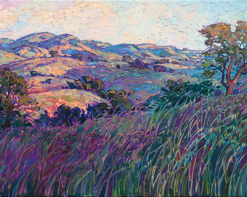 Style: "Open Impressionism" is a new style of painting developed by American artist Erin Hanson. The style is characterized by short, impasto brush strokes that are applied without layering, creating a mosaic or stained-glass appearance to the paintings. The paintings are created with a limited palette of colors, applied without blending or mixing upon the canvas, which adds a dimension of texture to each brush stroke. Inspired by classic impressionism, pointillism, and post-impressionism, Erin Hanson continues the tradition of impressionism into the modern day with her colorful and vivacious landscape paintings.