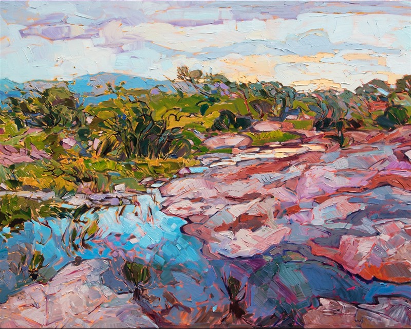 The Texas hill country near Fredericksburg is one of the most paintable regions in Texas. I love the rocky outcroppings and low oaks and mesquite trees growing alongside the many streams. At sunset the colors become more saturated and rich, as I captured in this painting. The brush strokes are loose and impressionistic, alive with motion and texture.