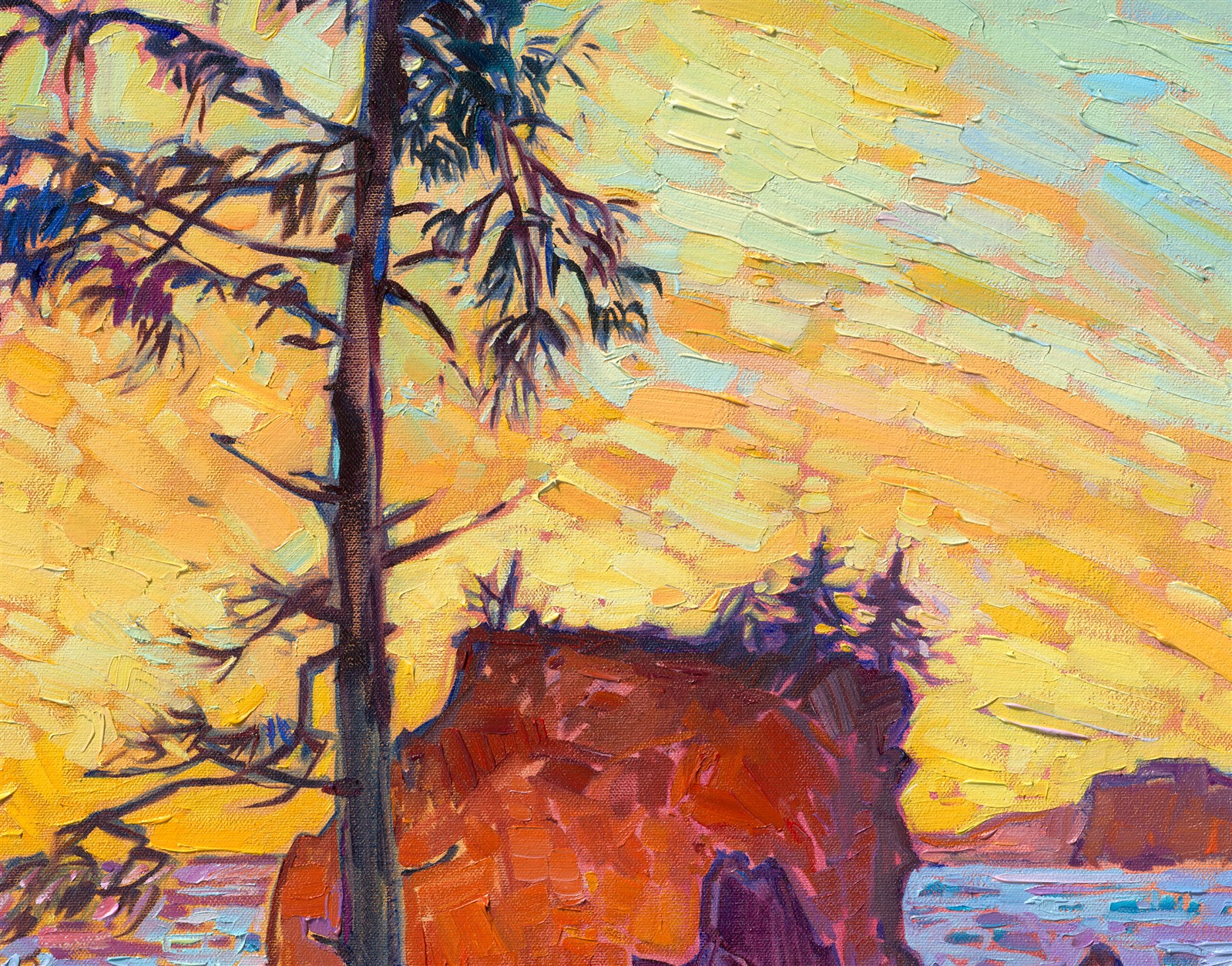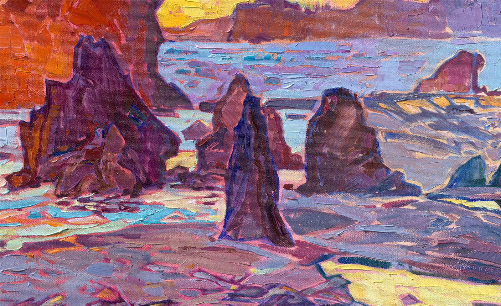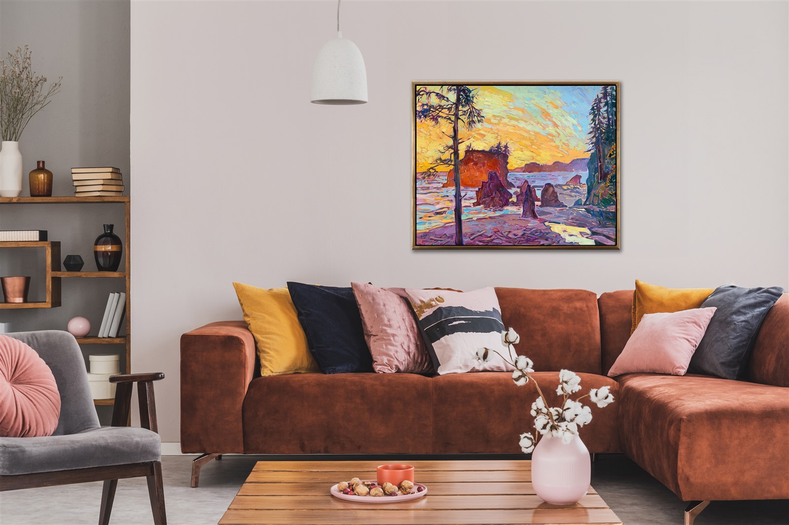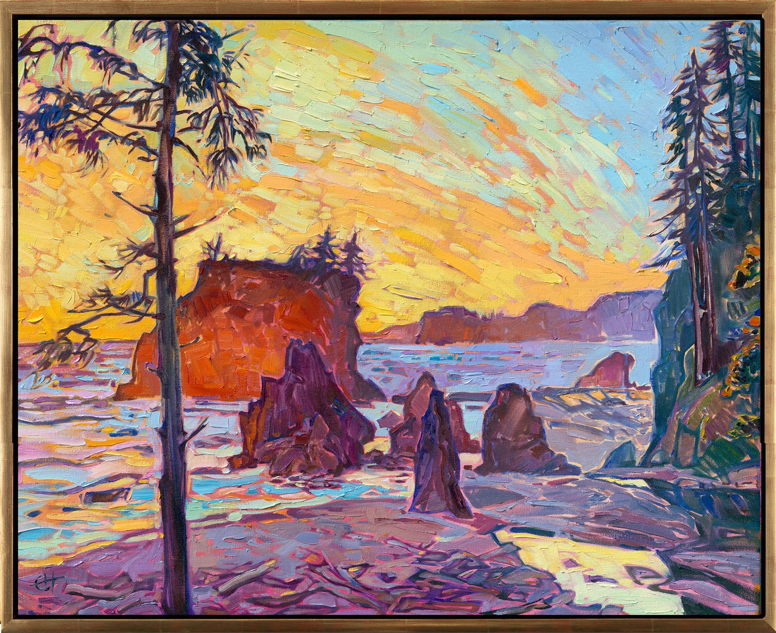 Washington's most visited national park, Olympic National Park, is captured for the first time in Erin Hanson's signature Open Impressionism style. The artist visited the Olympic Peninsula this summer to capture the colorful vistas and landscapes from Sequim, Hoh Forest, and the epic and varying coastline. This painting of Ruby Beach was inspired by golden hour light, where the yellow sky and highlights contrasted beautifully with purple shadows. Thick, expressive brushstrokes capture the movement and transient light of the scene.