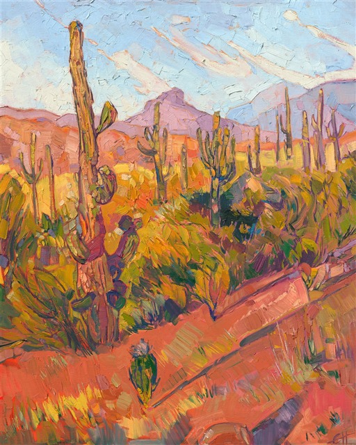Arizona Saguaros gather together to soak in the warmth of a late afternoon sun. The brush strokes in this painting are lively and boldly applied, bringing a modern look to a traditional landscape. The desert colors seem to jump from the canvas! This painting was inspired by the artist's recent travels to Prescott, the spring colors bringing to life the red sand and distant buttes of Arizona.