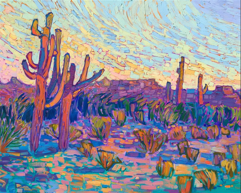 Note on varnishing: Erin’s paintings take six to eight weeks to dry, at which time we apply a retouching varnish, which allows the painting to complete the curing process while having a layer of protection against dirt and scuffs. The full curing process for an impasto oil painting takes at least two years. We are happy to assist in applying a final finishing varnish to your Erin Hanson oil painting once it has been dry for at least two years. Here is more information on how to care for your original oil painting.