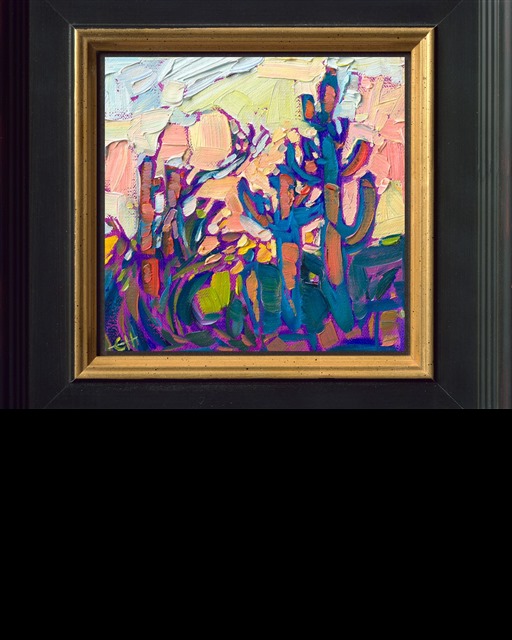 "Saguaro Petite" is an original oil painting on linen board. The piece arrives framed in a plein air frame, ready to hang.