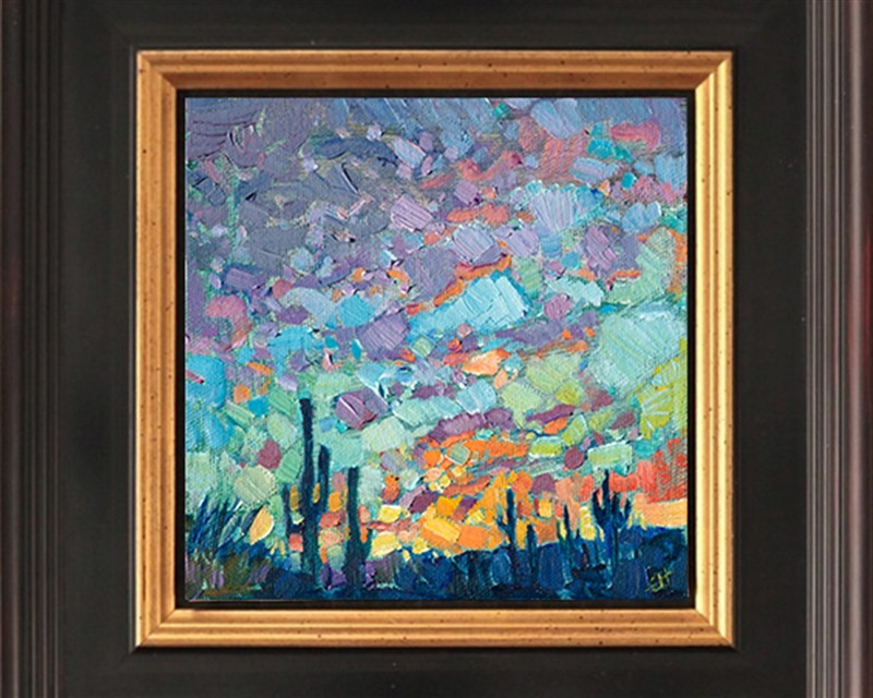 Note on varnishing: Erin’s paintings take six to eight weeks to dry, at which time we apply a retouching varnish, which allows the painting to complete the curing process while having a layer of protection against dirt and scuffs. The full curing process for an impasto oil painting takes at least two years. We are happy to assist in applying a final finishing varnish to your Erin Hanson oil painting once it has been dry for at least two years. Here is more information on how to care for your original oil painting.