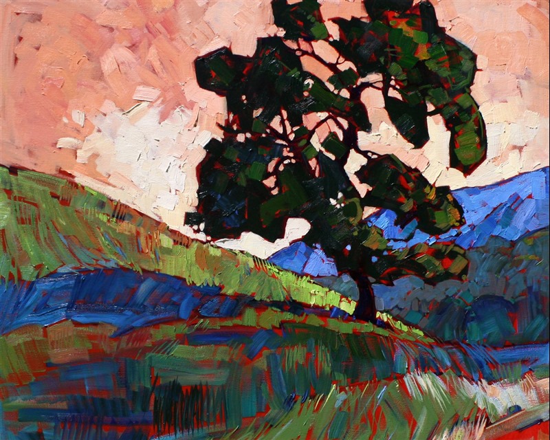 Style: "Open Impressionism" is a new style of painting developed by American artist Erin Hanson. The style is characterized by short, impasto brush strokes that are applied without layering, creating a mosaic or stained-glass appearance to the paintings. The paintings are created with a limited palette of colors, applied without blending or mixing upon the canvas, which adds a dimension of texture to each brush stroke. Inspired by classic impressionism, pointillism, and post-impressionism, Erin Hanson continues the tradition of impressionism into the modern day with her colorful and vivacious landscape paintings.