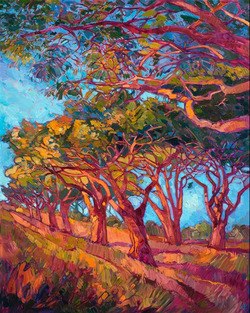 Style: "Open Impressionism" is a new style of painting developed by American artist Erin Hanson. The style is characterized by short, impasto brush strokes that are applied without layering, creating a mosaic or stained-glass appearance to the paintings. The paintings are created with a limited palette of colors, applied without blending or mixing upon the canvas, which adds a dimension of texture to each brush stroke. Inspired by classic impressionism, pointillism, and post-impressionism, Erin Hanson continues the tradition of impressionism into the modern day with her colorful and vivacious landscape paintings.