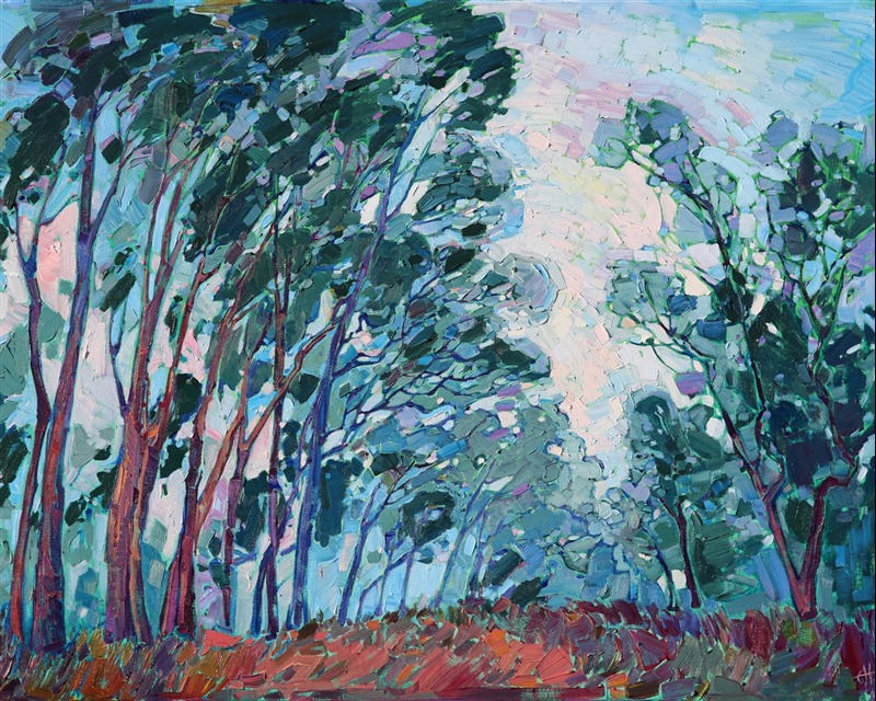 Early morning fog lingers in the eucalptus trees of Scripps Ranch, along the path where I like to jog in the mornings. The summer greens of these elegant trees fade into hues of blue and lavender in the morning fog. The brush strokes are loose and painterly, capturing and stimulating the imagination.