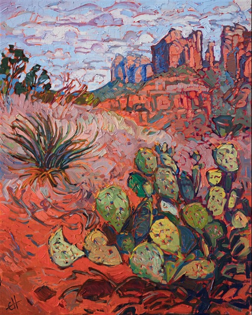 An Arizona prickly pear stands pertly on the top of a curving hill overlooking a distant butte, in Sedona. The red desert sand is a beautiful contrast to the desert plant life. The brush strokes in this painting are thick and impressionistic, capturing the motion and color of the outdoors.
