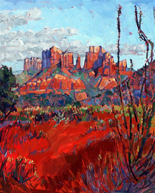 Sedona in all its red glory. The brush strokes are thick and impressionistic.