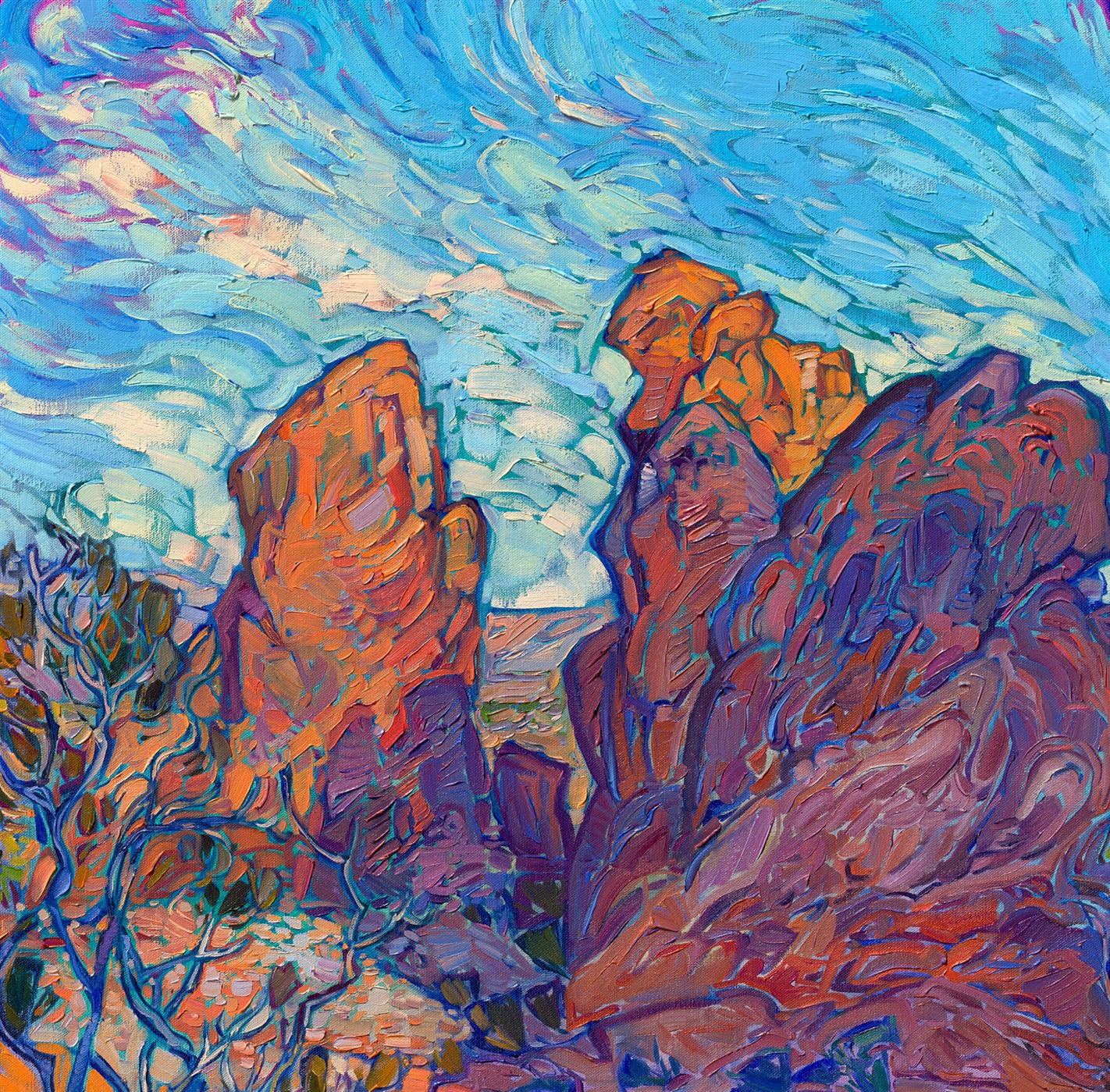 Style: "Open Impressionism" is a new style of painting developed by American artist Erin Hanson. The style is characterized by short, impasto brush strokes that are applied without layering, creating a mosaic or stained-glass appearance to the paintings. The paintings are created with a limited palette of colors, applied without blending or mixing upon the canvas, which adds a dimension of texture to each brush stroke. Inspired by classic impressionism, pointillism, and post-impressionism, Erin Hanson continues the tradition of impressionism into the modern day with her colorful and vivacious landscape paintings.