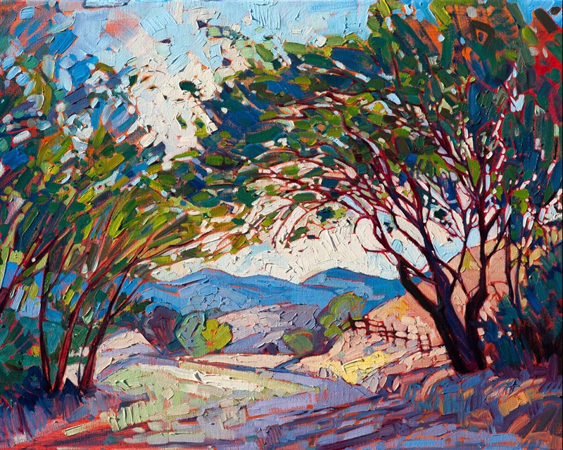 Style: "Open Impressionism" is a new style of painting developed by American artist Erin Hanson. The style is characterized by short, impasto brush strokes that are applied without layering, creating a mosaic or stained-glass appearance to the paintings. The paintings are created with a limited palette of colors, applied without blending or mixing upon the canvas, which adds a dimension of texture to each brush stroke. Inspired by classic impressionism, pointillism, and post-impressionism, Erin Hanson continues the tradition of impressionism into the modern day with her colorful and vivacious landscape paintings.