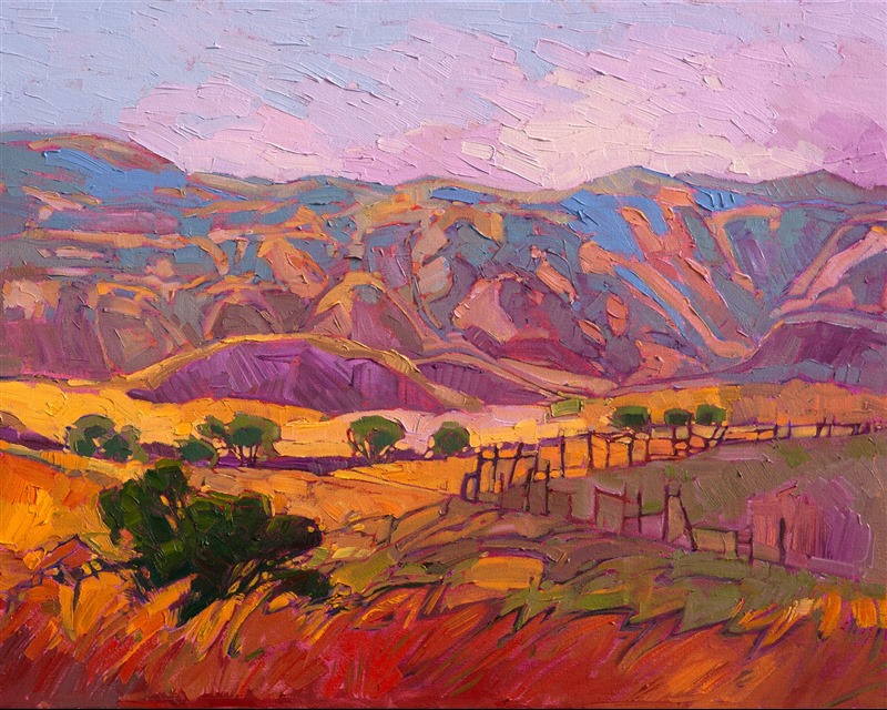 Style: "Open Impressionism" is a new style of painting developed by American artist Erin Hanson. The style is characterized by short, impasto brush strokes that are applied without layering, creating a mosaic or stained-glass appearance to the paintings. The paintings are created with a limited palette of colors, applied without blending or mixing upon the canvas, which adds a dimension of texture to each brush stroke. Inspired by classic impressionism, pointillism, and post-impressionism, Erin Hanson continues the tradition of impressionism into the modern day with her colorful and vivacious landscape paintings.