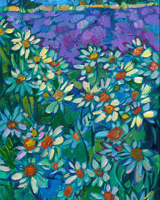 Style: "Open Impressionism" is a new style of painting developed by American artist Erin Hanson. The style is characterized by short, impasto brush strokes that are applied without layering, creating a mosaic or stained-glass appearance to the paintings. The paintings are created with a limited palette of colors, applied without blending or mixing upon the canvas, which adds a dimension of texture to each brush stroke. Inspired by classic impressionism, pointillism, and post-impressionism, Erin Hanson continues the tradition of impressionism into the modern day with her colorful and vivacious landscape paintings.
