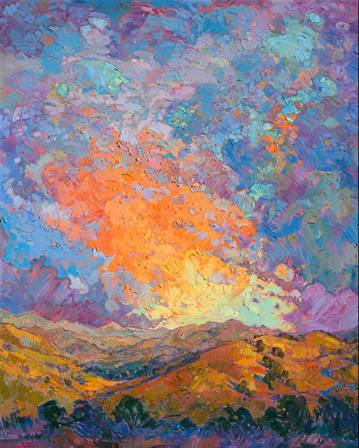 Note on varnishing: Erin’s paintings take six to eight weeks to dry, at which time we apply a retouching varnish, which allows the painting to complete the curing process while having a layer of protection against dirt and scuffs. The full curing process for an impasto oil painting takes at least two years. We are happy to assist in applying a final finishing varnish to your Erin Hanson oil painting once it has been dry for at least two years. Here is more information on how to care for your original oil painting.
