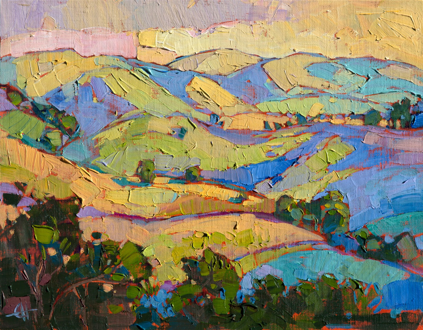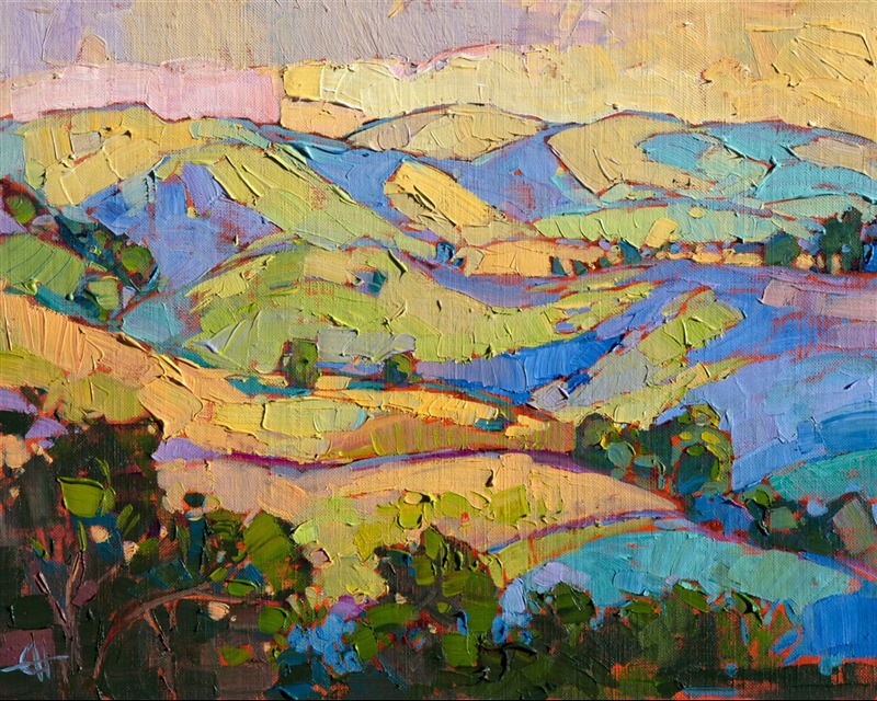 Rainbow sherbet colors of summer glimmer on these hills of Paso Robles wine country. The brush strokes are loose and impressionistic, capturing a fleeting impression of the landscape.