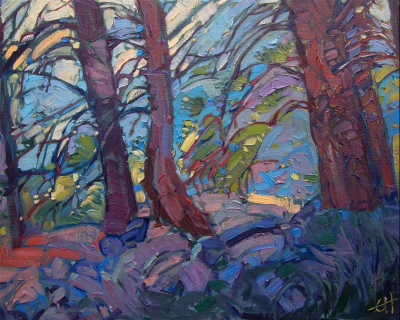 Note on varnishing: Erin’s paintings take six to eight weeks to dry, at which time we apply a retouching varnish, which allows the painting to complete the curing process while having a layer of protection against dirt and scuffs. The full curing process for an impasto oil painting takes at least two years. We are happy to assist in applying a final finishing varnish to your Erin Hanson oil painting once it has been dry for at least two years. Here is more information on how to care for your original oil painting.